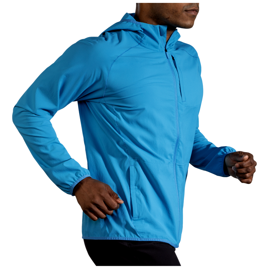 Ultra-comfy, not “sort-of” comfy. Made from lightweight, breathable fabric, this men’s running jacket blocks wind, resists rain, and packs down small for easy storage.